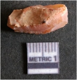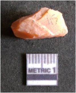 | Description / विवरण | The rosy quartz flake has sharp flaked edges and pointed ends as a result of flaking. The piece is semi-transparent in nature with irregular fracture pattern. The piece is roughly triangular in shape and has a prominent bulb of percussion. |
