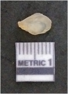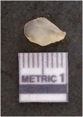 | Description / विवरण | The chalcedony flake is pale in colour and translucent in appearance. The piece has s harp flaked ends and a bulbous end due to flaking. The flake has a crypto-crystalline silica matrix. |