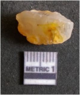 | Description / विवरण | It is chalcedony flake, translucent in appearance. The piece shows sharp pointed ends and flake scars on the surface as a result of flaking. The piece shows a bulb of percussion. |