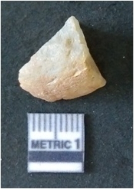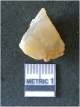 | Description / विवरण | It is chalcedony flake, translucent in appearance. The piece shows sharp pointed ends and flake scars on the surface as a result of flaking. The piece shows a bulb of percussion. |