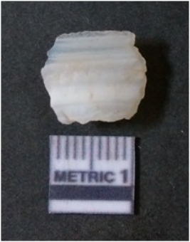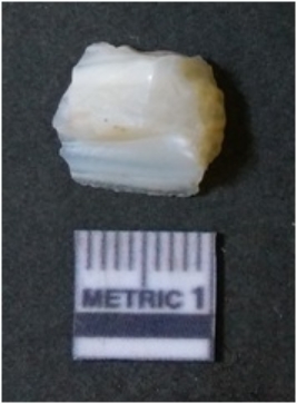 | Description / विवरण | The banded agate piece is crystalline in nature, with a smooth fracture pattern and visible bands on the flaked sides. The piece is pale in color and has sharp flaked ends. |