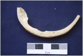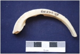 | Description / विवरण | A piece of shell bangle manufacturing waste. Some infestation marks. Glossy interior. |