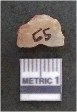 | Description / विवरण | The chalcedony flake is pale in colour and translucent in appearance. The piece has s harp flaked ends and a bulbous end due to flaking. The flake has a crypto-crystalline silica matrix. |