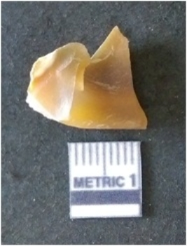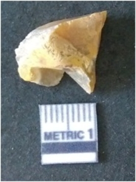 | Description / विवरण | It is chalcedony flake, translucent in appearance. The piece shows sharp pointed ends and flake scars on the surface as a result of flaking. The piece shows a bulb of percussion. |