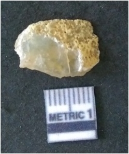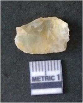 | Description / विवरण | It is chalcedony flake, translucent in appearance. The piece shows sharp pointed ends and flake scars on the surface as a result of flaking. The piece shows a bulb of percussion. |