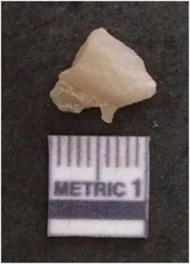 | Description / विवरण | The chalcedony flake is pale in colour and translucent in appearance. The piece has s harp flaked ends and a bulbous end due to flaking. The flake has a crypto-crystalline silica matrix. |