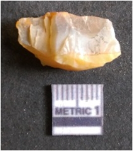 | Description / विवरण | It is chalcedony flake, translucent in appearance. The piece shows sharp pointed ends and flake scars on the surface as a result of flaking. The piece shows a bulb of percussion. |