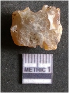 | Description / विवरण | It is chalcedony flake, translucent in appearance. The piece shows sharp pointed ends and flake scars on the surface as a result of flaking. The piece shows a bulb of percussion. |