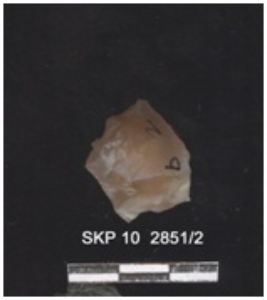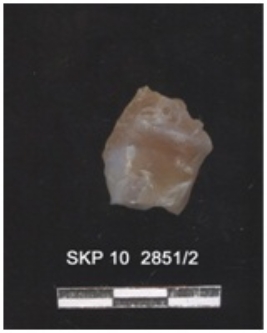 | Description / विवरण | Lithic debitage on chalcedony. It is orangish in color. Ridges and striking platform on can be seen. Bulb of percussion can be seen. |