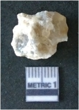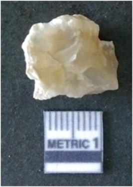 | Description / विवरण | The quartz flake has sharp flaked edges and pointed ends as a result of flaking. The piece is semi-transparent in nature with irregular fracture pattern. The piece is roughly triangular in shape and has a prominent bulb of percussion. |
