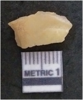 | Description / विवरण | The chalcedony flake is pale in colour and translucent in appearance. The piece has s harp flaked ends and a bulbous end due to flaking. The flake has a crypto-crystalline silica matrix. |
