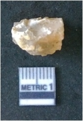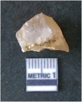 | Description / विवरण | It is chalcedony flake, translucent in appearance. The piece shows sharp pointed ends and flake scars on the surface as a result of flaking. The piece shows a bulb of percussion. |