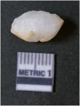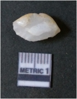 | Description / विवरण | The quartz flake has sharp flaked edges and pointed ends as a result of flaking. The piece is semi-transparent in nature with irregular fracture pattern. The piece is roughly triangular in shape and has a prominent bulb of percussion. |