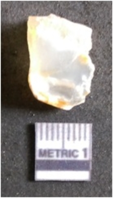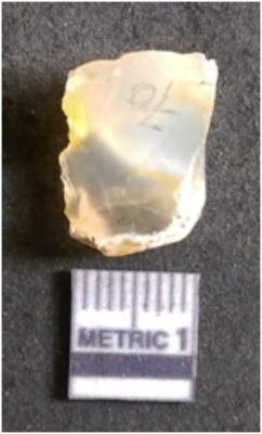 | Description / विवरण | It is chalcedony flake, translucent in appearance. The piece shows sharp pointed ends and flake scars on the surface as a result of flaking. The piece shows a bulb of percussion. |