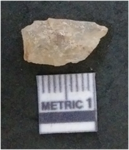 | Description / विवरण | The chalcedony flake is pale in colour and translucent in appearance. The piece has s harp flaked ends and a bulbous end due to flaking. The flake has a crypto-crystalline silica matrix. |