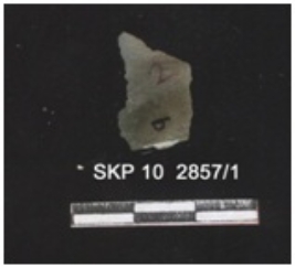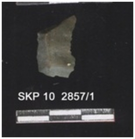 | Description / विवरण | Lithic debitage on chert, the ridges and striking platform can be seen clearly. The sides are retouched and the bulb of percussion can be seen. |