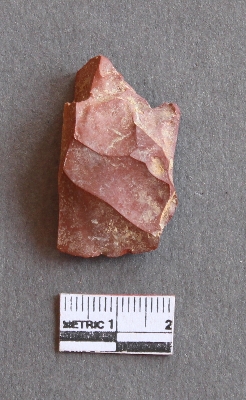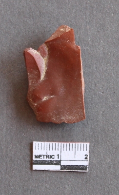 | Description / विवरण | It is lithic debitage have flaked ends and angular edges. It is jasper flake with a notched end and flake scars. |