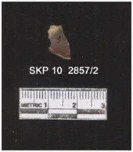 | Description / विवरण | Lithic debitage on chert, the ridges and striking platform can be seen clearly. The sides are retouched and the bulb of percussion can be seen. |