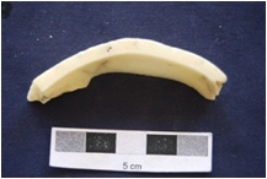 | Description / विवरण | A piece of shell bangle manufacturing waste. Some worm infestation holes. Glossy interior. |