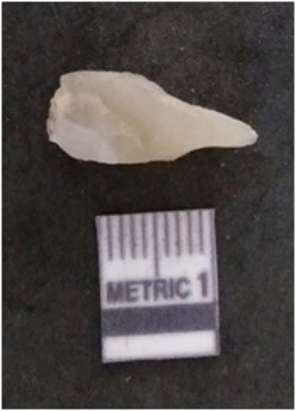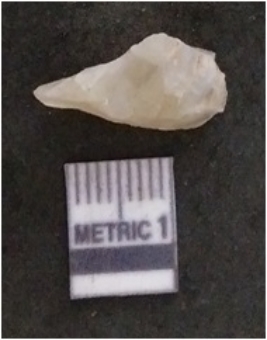 | Description / विवरण | The chalcedony flake is pale in colour and translucent in appearance. The piece has s harp flaked ends and a bulbous end due to flaking. The flake has a crypto-crystalline silica matrix. |