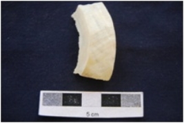 | Description / विवरण | A piece of shell bangle manufacturing waste. Glossy interior. |