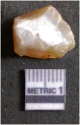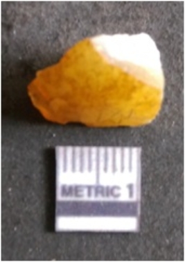 | Description / विवरण | It is chalcedony flake, translucent in appearance. The piece shows sharp pointed ends and flake scars on the surface as a result of flaking. The piece shows a bulb of percussion. |