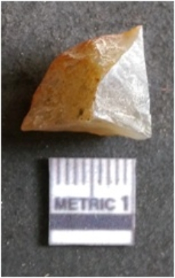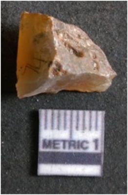 | Description / विवरण | The smoky quartz flake has sharp flaked edges and pointed ends as a result of flaking. The piece is semi-transparent in nature with irregular fracture pattern. The piece is roughly triangular in shape and has a prominent bulb of percussion. |