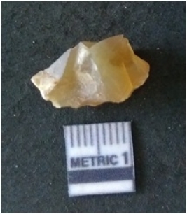 | Description / विवरण | It is chalcedony flake, translucent in appearance. The piece shows sharp pointed ends and flake scars on the surface as a result of flaking. The piece shows a bulb of percussion. |