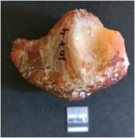 | Description / विवरण | The chalcedony flake is pale in colour and translucent in appearance. The piece has s harp flaked ends and a bulbous end due to flaking. The flake has a crypto-crystalline silica matrix. |