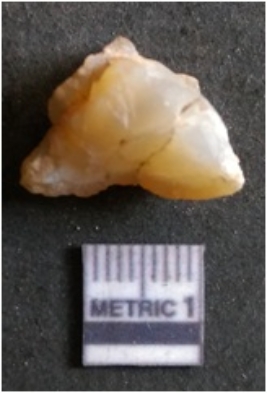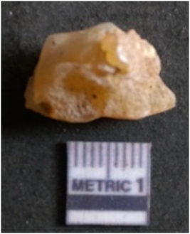 | Description / विवरण | It is chalcedony flake, translucent in appearance. The piece shows sharp pointed ends and flake scars on the surface as a result of flaking. The piece shows a bulb of percussion. |
