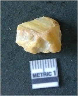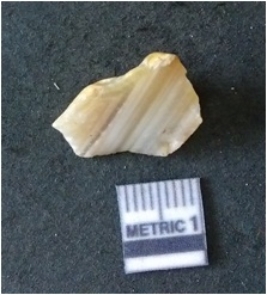 | Description / विवरण | The banded agate piece is crystalline in nature, with a smooth fracture pattern and visible bands on the flaked sides. The piece is pale in color and has sharp flaked ends. |