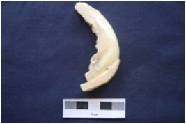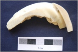 | Description / विवरण | Fragment of shell circlet gas cut marks, partly irregular interior, medium polished and rough rectangular cross-section. |