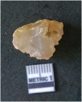 | Description / विवरण | It is chalcedony flake, translucent in appearance. The piece shows sharp pointed ends and flake scars on the surface as a result of flaking. The piece shows a bulb of percussion. |