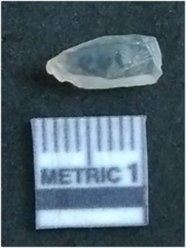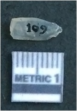| Description / विवरण | The chalcedony flake is pale in colour and translucent in appearance. The piece has s harp flaked ends and a bulbous end due to flaking. The flake has a crypto-crystalline silica matrix. |