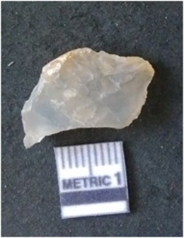 | Description / विवरण | The quartz flake has sharp flaked edges and pointed ends as a result of flaking. The piece is semi-transparent in nature with irregular fracture pattern. The piece is roughly triangular in shape and has a prominent bulb of percussion. |