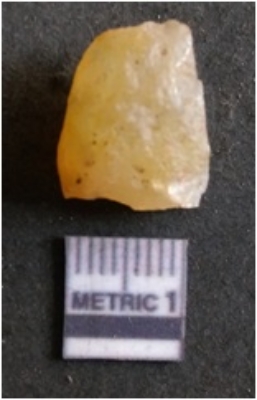 | Description / विवरण | It is chalcedony flake, translucent in appearance. The piece shows sharp pointed ends and flake scars on the surface as a result of flaking. The piece shows a bulb of percussion. |