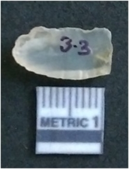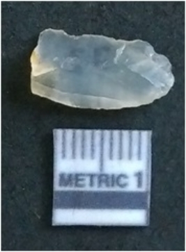 | Description / विवरण | The chalcedony flake is pale in colour and translucent in appearance. The piece has s harp flaked ends and a bulbous end due to flaking. The flake has a crypto-crystalline silica matrix. |