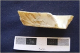| Description / विवरण | Fragment of shell circlet has partly irregular interior, rectangular cross-section and medium polished. |