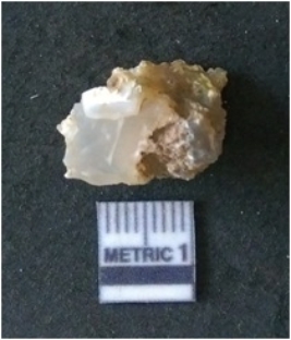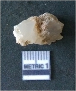 | Description / विवरण | The flake has irregular fracture pattern and sharp flaked edges as a result of lithic knapping activity. The piece is pale, with surfacial flake scars and a bulbous end. The flake is of smoky quartz variety, grayish in colour and translucent in appearance. |