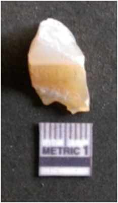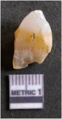 | Description / विवरण | The quartz flake has sharp flaked edges and pointed ends as a result of flaking. The piece is semi-transparent in nature with irregular fracture pattern. The piece is roughly triangular in shape and has a prominent bulb of percussion. |
