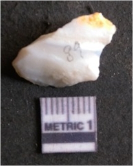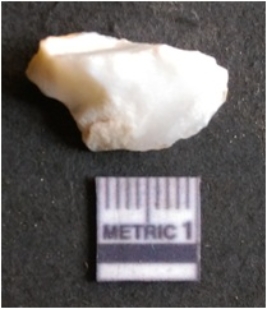 | Description / विवरण | The quartz flake has sharp flaked edges and pointed ends as a result of flaking. The piece is semi-transparent in nature with irregular fracture pattern. The piece is roughly triangular in shape and has a prominent bulb of percussion. |