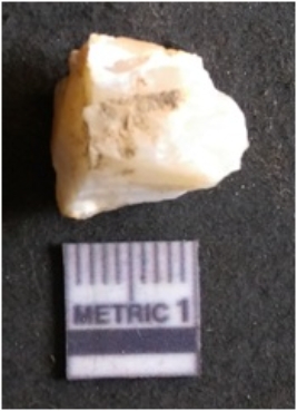 | Description / विवरण | The quartz flake has sharp flaked edges and pointed ends as a result of flaking. The piece is semi-transparent in nature with irregular fracture pattern. The piece is roughly triangular in shape and has a prominent bulb of percussion. |