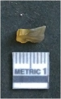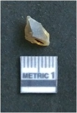 | Description / विवरण | The flake is of smoky quartz variety, grayish in colour and translucent in appearance. The flake has irregular fracture pattern and sharp flaked edges as a result of lithic knapping activity. The piece is pale, with surfacial flake scars and a bulbous end |