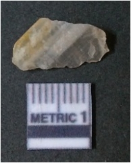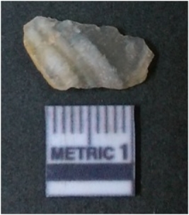 | Description / विवरण | The banded agate piece is crystalline in nature, with a smooth fracture pattern and visible bands on the flaked sides. The piece is pale in color and has sharp flaked ends. |