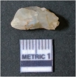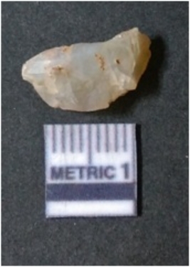 | Description / विवरण | The quartz flake has sharp flaked edges and pointed ends as a result of flaking. The piece is semi-transparent in nature with irregular fracture pattern. The piece is roughly triangular in shape and has a prominent bulb of percussion. |
