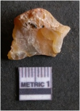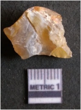 | Description / विवरण | The chalcedony flake has sharp flaked edges and pointed ends as a result of flaking. The piece is semi-transparent in nature with irregular fracture pattern. The piece is roughly triangular in shape and has a prominent bulb of percussion. |