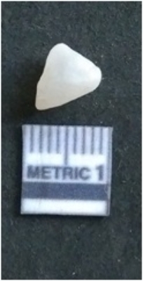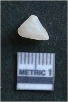 | Description / विवरण | The quartz flake has irregular fracture pattern and sharp flaked edges as a result of lithic knapping activity. The piece is pale, with surfacial flake scars and a bulbous end. |