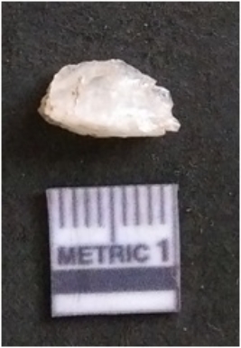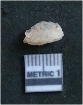 | Description / विवरण | The quartz flake has irregular fracture pattern and sharp flaked edges as a result of lithic knapping activity. The piece is pale, with surfacial flake scars and a bulbous end. |