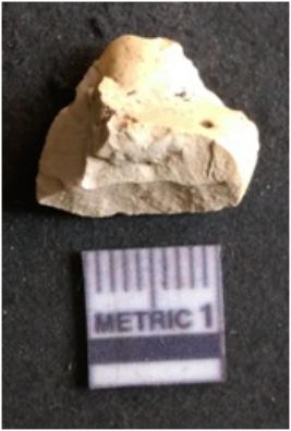 | Description / विवरण | The chert piece is dark in color, with a prominent bulb of percussion and sharp flaked edges. The piece is a part of lithic debitage or raw material for lithic knapping. The piece shows clear ripple marks and bulb of percussion. |