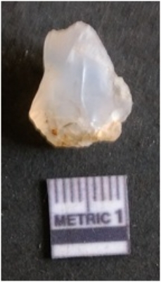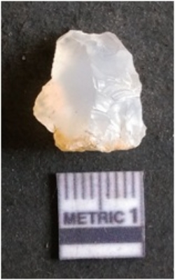 | Description / विवरण | The quartz flake has sharp flaked edges and pointed ends as a result of flaking. The piece is semi-transparent in nature with irregular fracture pattern. The piece is roughly triangular in shape and has a prominent bulb of percussion. |